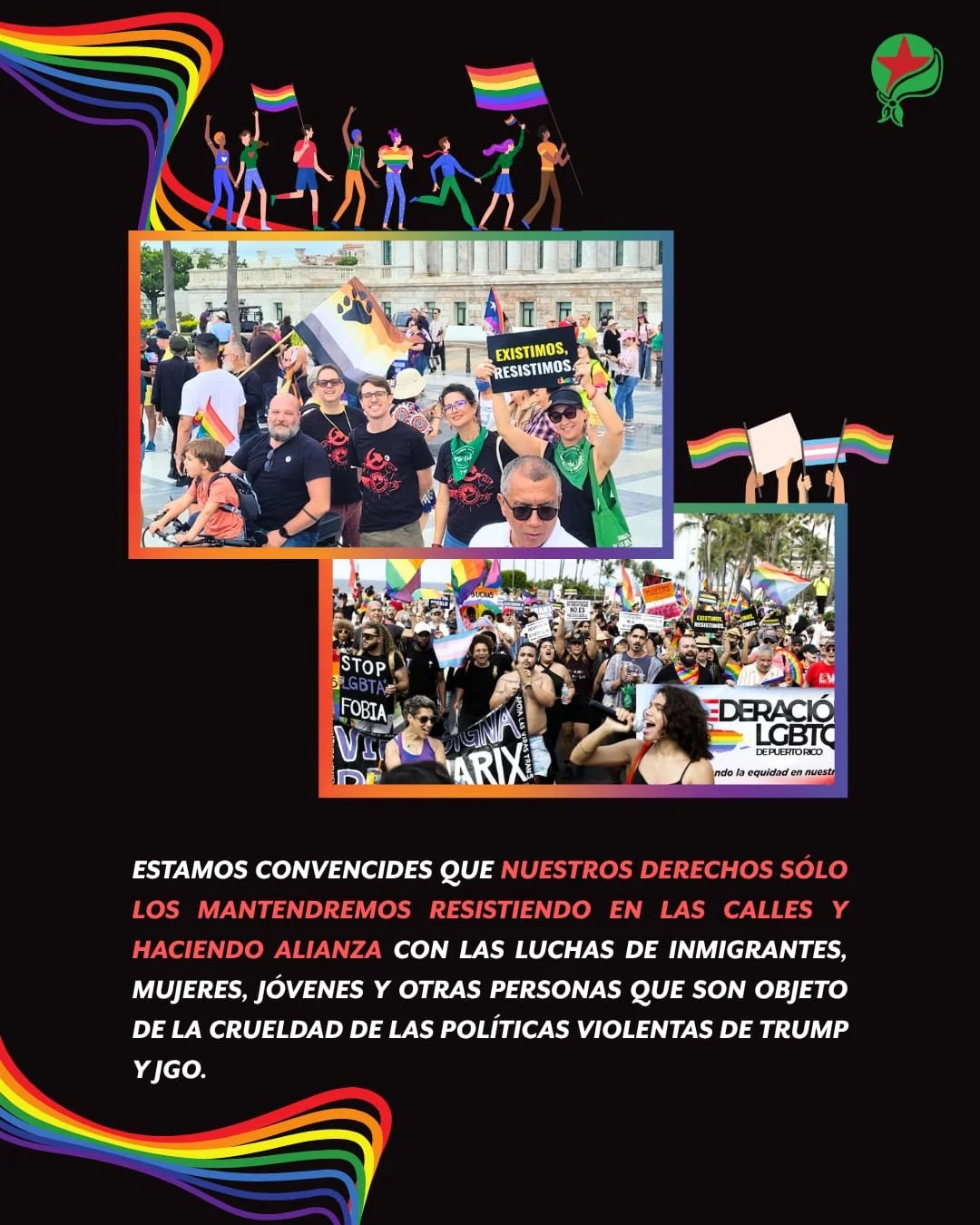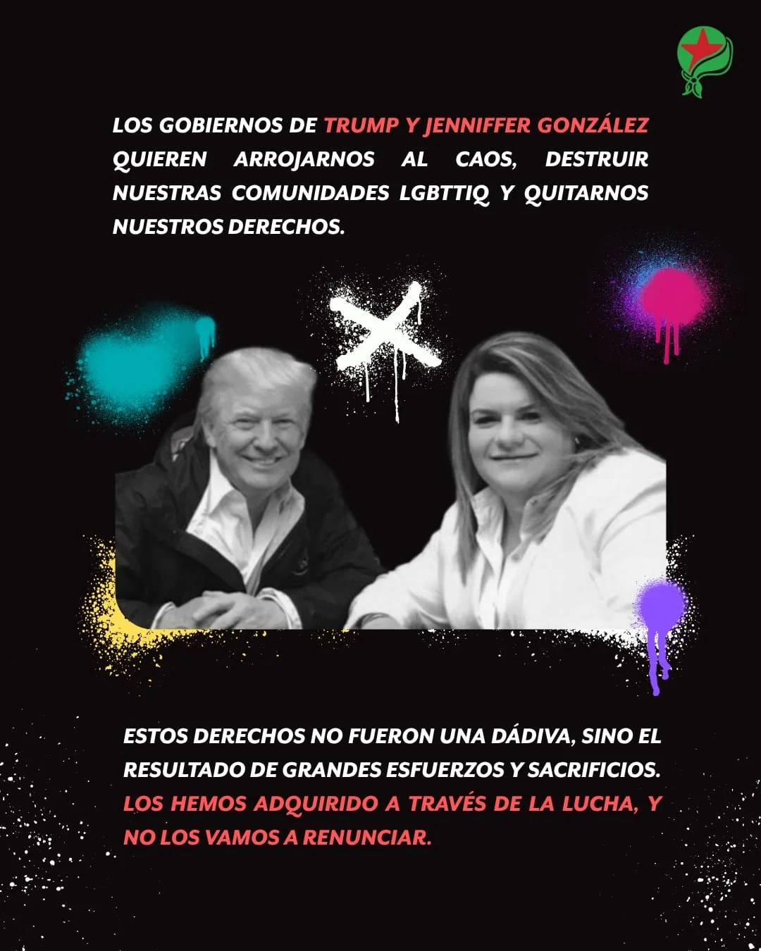 Los gobiernos de Trump y de Jenniffer González quieren arrojarnos al caos, destruir nuestras comunidades LGBTTIQ y quitarnos nuestros derechos. Esos derechos no fueron una dádiva sino el resultado de grandes esfuerzos y sacrificios. Son derechos que hemos adquirido a través de la lucha, y no los vamos a renunciar.