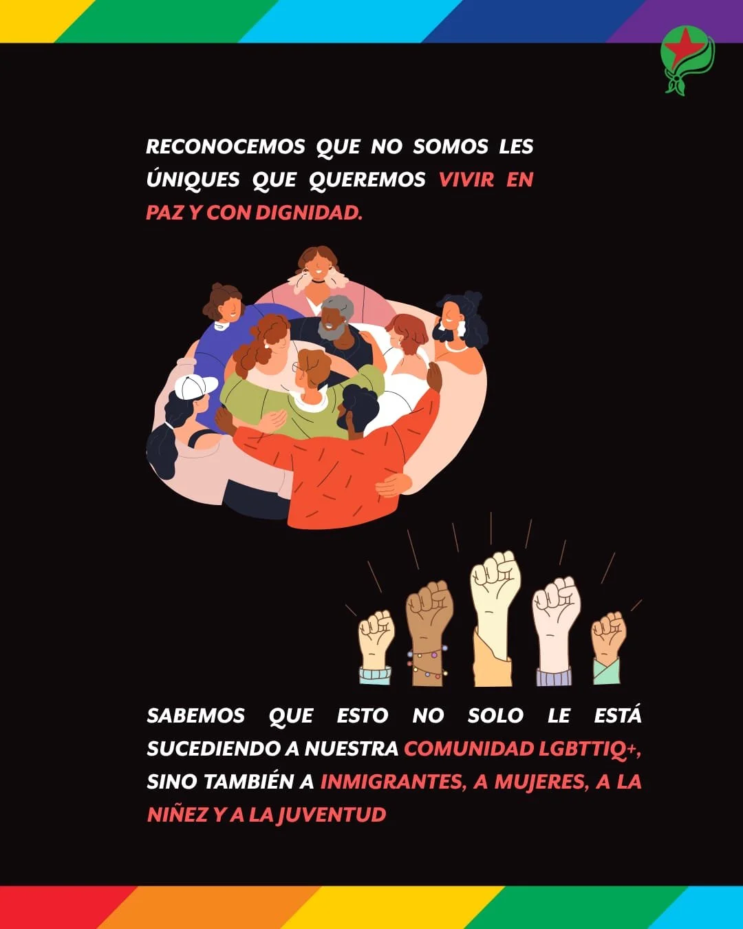 Reconocemos que no somos les úniques que queremos vivir en paz y con dignidad. Sabemos que esto no solo le está sucediendo a nuestra comunidad LGBTTIQ+, sino también a inmigrantes, a mujeres, a la niñez y a la juventud.